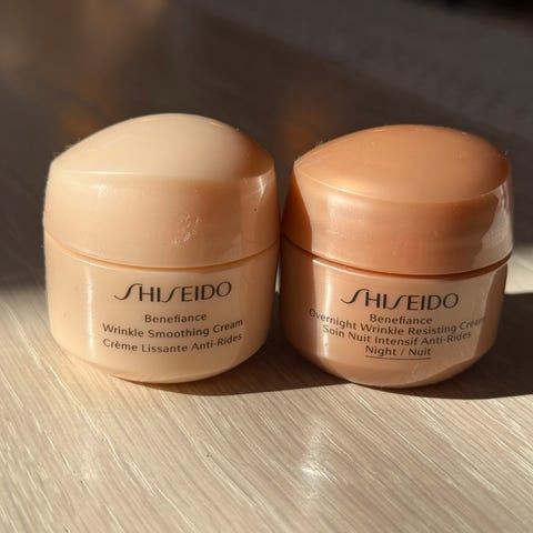 Selger en liten travel veske fra Shiseido med Wrinkle Smoothing Cream og Wrinkle Smoothing Serum (anti-rynke serum), henholdsvis 15 og 5 ml.