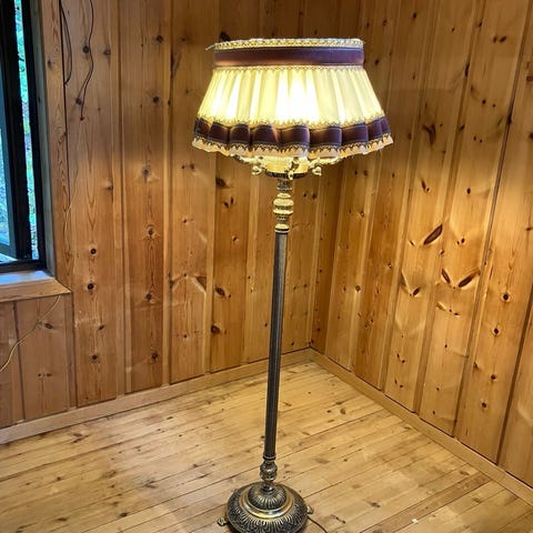 To flotte originale lamper i tre og messing og med lin skjerm med bånd og frynser