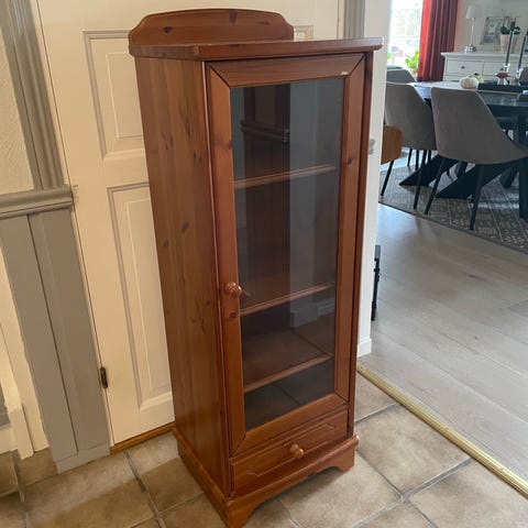 Selges et klassisk skap i solid treverk med fine glassdører og fire hyller. Skapet har en elegant buet topp og passer perfekt til stue, spisestue eller som vitrineskap. Nøkkel følger med.