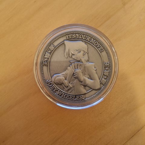 Official Yu-Gi-Oh coin fra 2020. Limited edition. Det er zinc alloy. Jeg kjøpte det fra comic con. Mynten har aldri blitt tatt ut fra beholderen sin, derfor jeg ikke viser det uten.