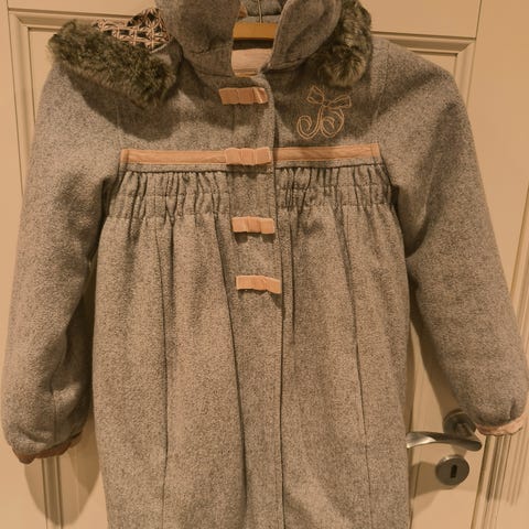 Nydelig brudepikekjole fra JJ house, brukt av datteren min noen timer. Kjolen har avtagbar sløyfe bak. Den har en fin lengde som gjør det er lett å bevege seg. Selger også bolero hun har på seg, jakken er av merket Monsoon str 7-8 år. Skoene hun har på seg kan også selges hvis ønskelig.