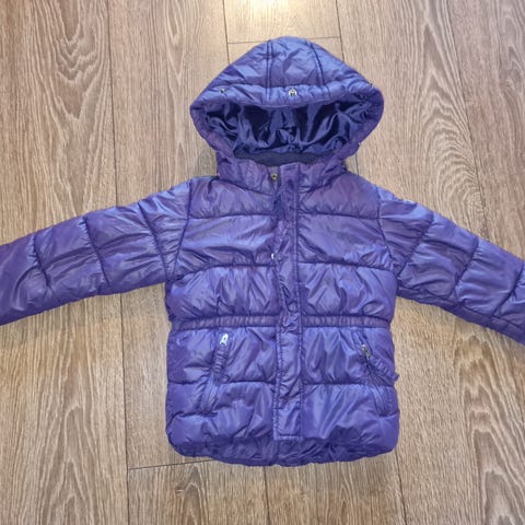 Kort men ganske tykk jakke. Prikker har bleknet nesten overalt. Ellers fin. Dobbeltsidig glidelås.