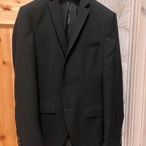 Fin slimfit set (65% ull) med dressjakke str 44/long og bukse 29' i kjøpt i Syden april 2025. Italiensk design, produsert i Europa.
