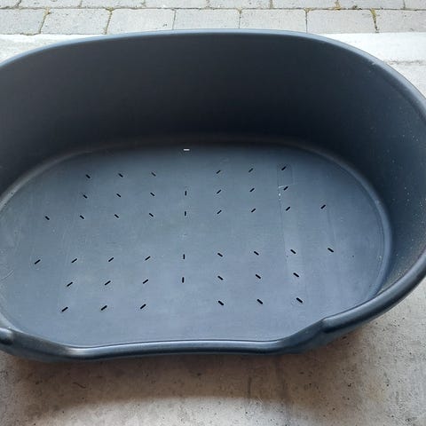 Kan brukes med saueskinn eller en myk seng oppi. Passer liten til mellomstor hund. Helt som ny!