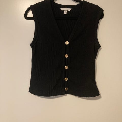 Svart bandeau-topp fra H&M & Balmain. Glidelås i gullfarge. Det står ingen størrelse inni, men den er ca. 29 cm bred. Toppen er laget i et elastisk materiale. Den kan sikkert også fungere som belte!
