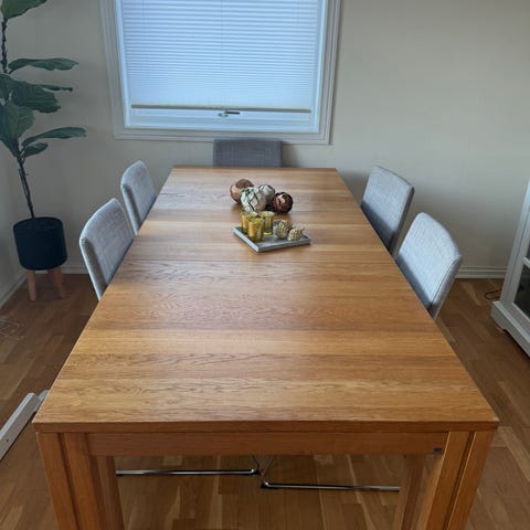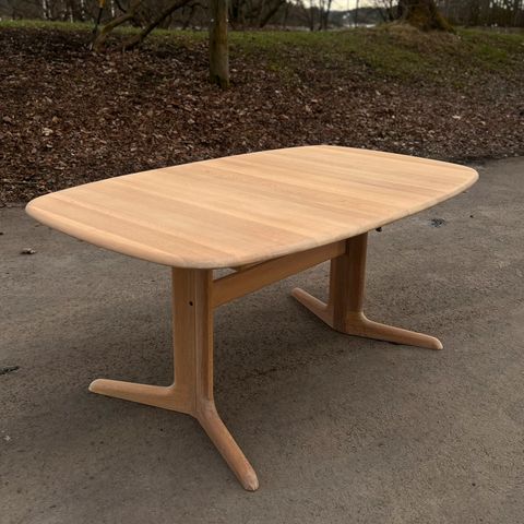 Nydelig spisebord i heltre lys eik selges. Bordet er pusset ned i sin helhet og behandlet med naturolje. 3 plater følger med som gjør bordet hele 3 meter. Disse kan lagres under bordet når de ikke er i bruk. Bordet fremkommer som strøkent.
