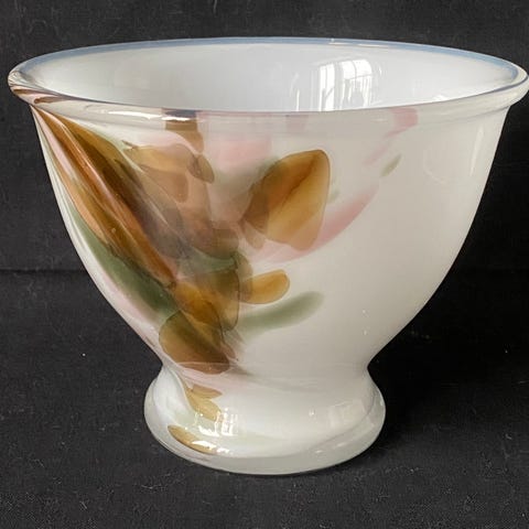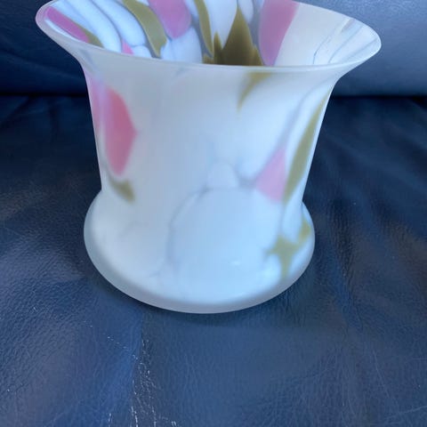 Nydelig skål vase i glass selges. Pastellfarger. Noe bruksmerker kan forekomme. Selges som den er. Se bilder.
