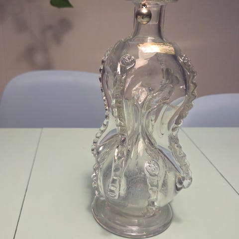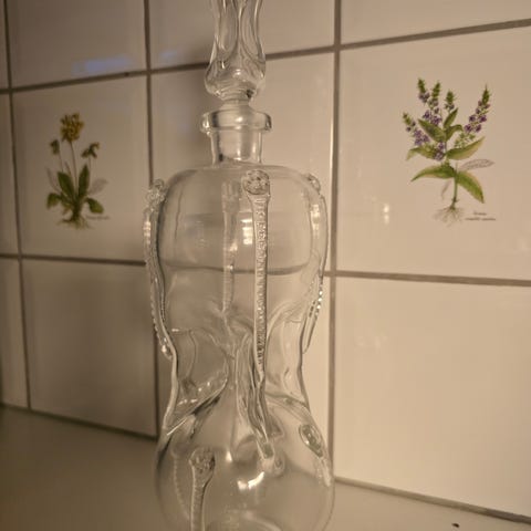 Jeg har i tillegg 2 andre flasker som er dekorative, men ikke like rare. Den ene inneholder noe grønt ( vann?) de har begge nydelige mønster og selges for 200 pr stk. hentes ved avtale på Slemdal.