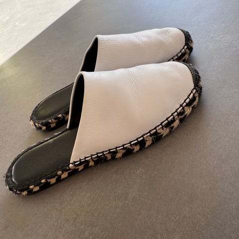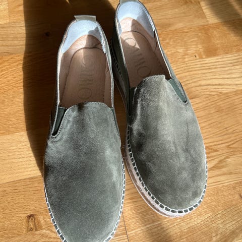 GAIMO er en flat platform-espadrille i semsket skinn med den karkteristiske flettede hemp sÄlen. SÄlen pÄ innsiden er laget i mykt skinn og har en dempende pute som gjÞr skoen myk og behagelig pÄ foten. Fantastisk gode sko!