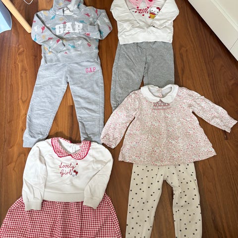 Selger en klespakke i størrelse 56. Klespakken inneholder: 4 langermede bodyer, en bukse, to pysjer, to luer, en kåpe.