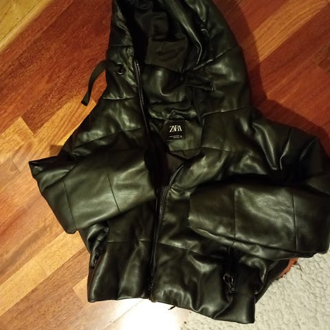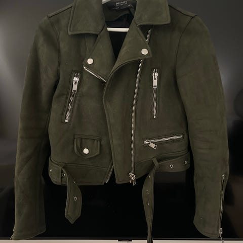 Fin og myk svart jakke i semsket skinn med metall detaljer selges da den bare blir hengende i skapet. Str. XS. Kan sendes med posten.