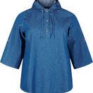 Denimbluse i 100 % bomull med kuttlinje i midjen for en feminin silhuett. Blusen er designet med lange ermer med elastiske mansjetter og åpen front med knytelukking.