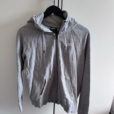 Til salgs: Brukt Nike-hoodie i grå farge, str. M. God stand, med hette og glidelås foran. Perfekt for trening eller hverdagsbruk.