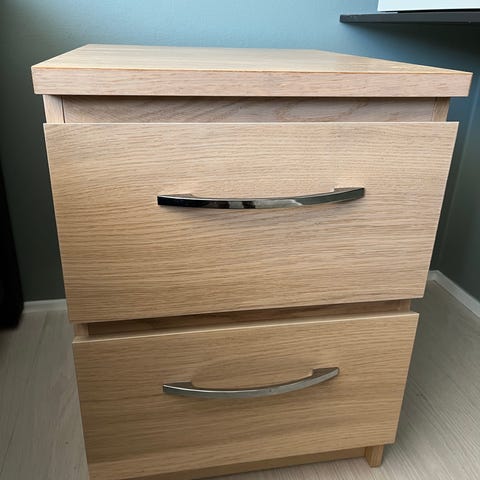 Nesten ubrukt kommode fra jysk selges. Det er ingen synlige skader, riper eller slitasje. Kommoden har tre skuffer og har en lys eik farge. Kommoden er nesten ubrukt og har bare stått på gjesterommet i 6 måneder.