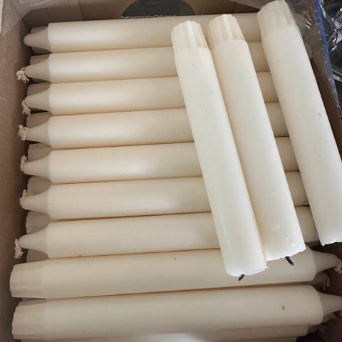En pakke høye hvite stearinlys fra IKEA (hull i plasten, men ubrukt), 35cm, samt 4 andre lys, 26cm.