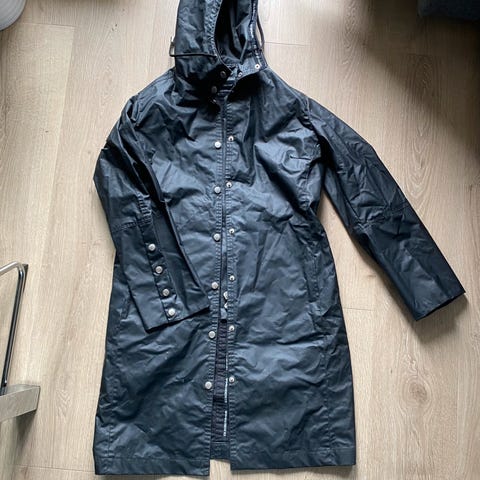Fin regnjakke eller regnfrakk i merket Ilse Jacobsen. Glidelåsen har mistet nederste del så den fungerer ikke helt, men knappene er funksjonelle så den kan fint brukes med bare knappene