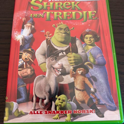 DreamWorks Shrek Den Tredje DVD med norsk tale. Animasjonsfilm fra DreamWorks som fortsetter eventyret om Shrek og vennene hans. Egnet for hele familien.