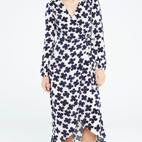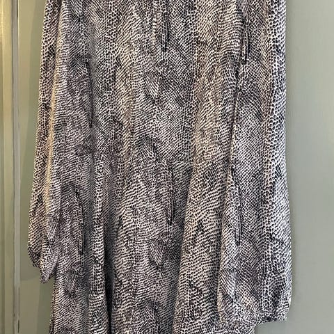 Dette er en omslagskjole med transparente ermer. Str XL- 42/ L-40. Synes den er mer L en XL.