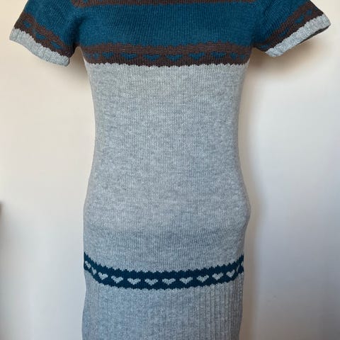 Selger en strikket hverdagskjole/tunika fra Ichi. Fargene er grå, rosa og vinrød. Hjertemønster og striper. Matchende cardigan følger med på kjøpet.