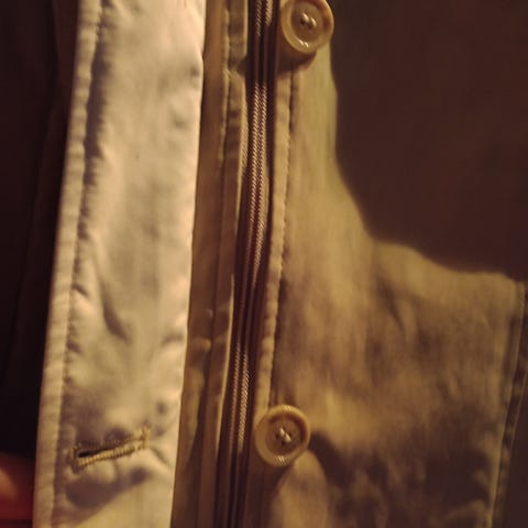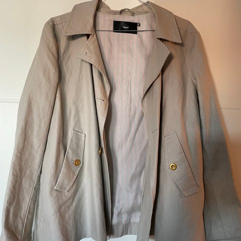 Flott lys beige kort trenchcoat fra Marks & Spencer. God bomullskvalitet og fine detaljer. Merket med britisk str. 16/44, men syns den er litt liten i str., så mer som en 42. Har gått opp bittelitt i sømmen nederst ved den ene lommen. Synes nesten ikke og har ingenting å si for bruken, men kan også fikses enkelt ved å sy et par sting. Se bilde.