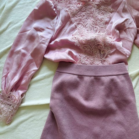 Fin skjorte i nydelig blekrosa farge selges. Skjorten har dekorativt bånd i halsen, som kan knyttes til sløyfe, eller bare henge ned. Skjorten er aldri brukt, men lappene er dessverre tatt av.