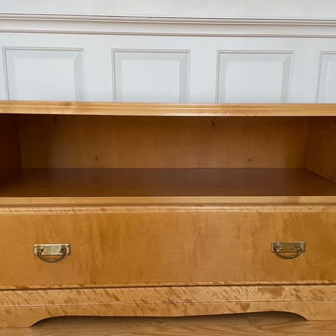 Et enkelt og pent nattbord i tre. Nattbordet har en skuff og ei hylle.