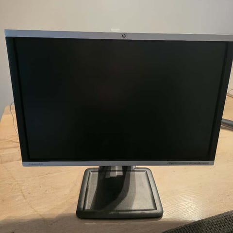 Selger en HP LP2475w i topp stand. Dette er en 24” skjerm med IPS-panel, kjent for svært gode farger og brede innsynsvinkler. Den har 1920x1200 oppløsning, solid byggekvalitet og fullt justerbart stativ (høyde, tilt, pivot, rotasjon).