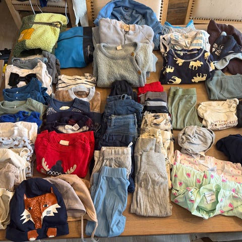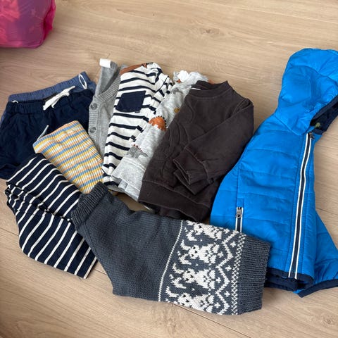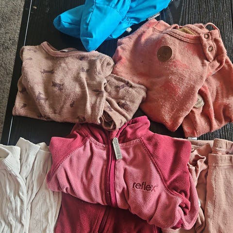 Ubrukt skalljakke med glidelås som går opp til siden istedenfor at den gnager i haka. Fleece sett, pluss en ekstra fleece jakke. Ull bukse og ullbody, 4 pysj drakter. Ull strømpebukse, en vanlig bukse, en body