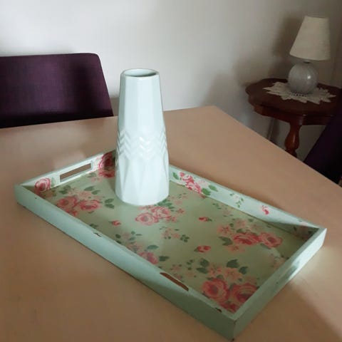 Eldre fat, brett med speil med fin blomsterdekorasjon, og dekorativ metallramme (usikker på hvilket metall) med 4 små/runde føtter. Flott til feks. stearinlys, blomster eller andre ting man ønsker å ‘stille’ ut :)