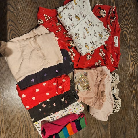 Pakke med stripete klær i lilla og rosa, størrelse 86.