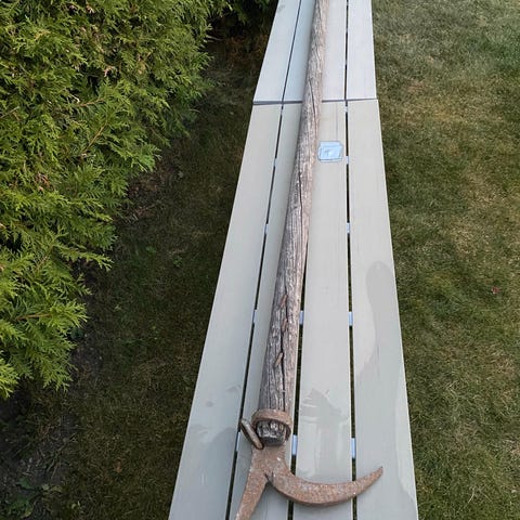 Ble kjøpt på auksjon for lenge siden og vi ble fortalt at det er ett gammelt redskap til å fløte tømmer. Jeg vet ikke alderen på det, mulig det er antikk.