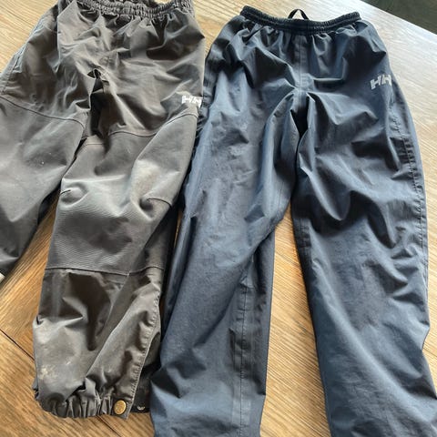 HH overtrekksbukser str 128 2 stk. Norm bruksslitasje. Ingen rifter/hull. Strikk i livet. Trykknapper nederst. Knapper på innsiden hvis en vil bruke strikker under skoene. Kr 300,- pr bukse
