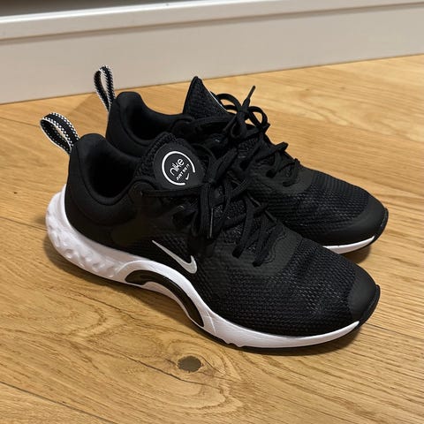 Nesten helt nye Nike sneakers, kun brukt en gang. Selger fordi de er litt for store for meg. Kule sko i beige/ offwhite, med gull og sorte detaljer. God såle.