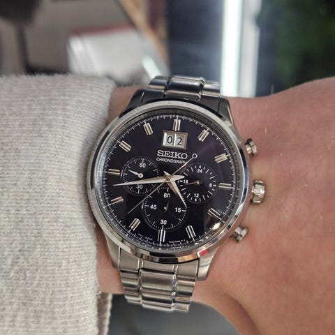 Funksjoner: Kronograf (sekunder og minutter), datoindikator (synlig ved 4-5-klokken), og tydelig layout med arabiske tall og markører.