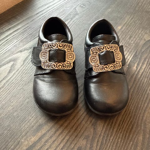 Pent brukte Ponny bunadsko med lærsåle selges. Spennen er avtagbar så skoene også kan brukes som sorte pensko. Nypris var 299,-.