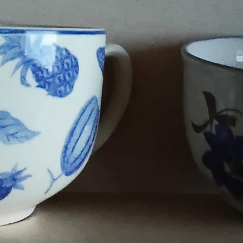 Mål på koppene er ca 11 cm høye og 10 cm brede uten hank. De rommer ca 5 dl.