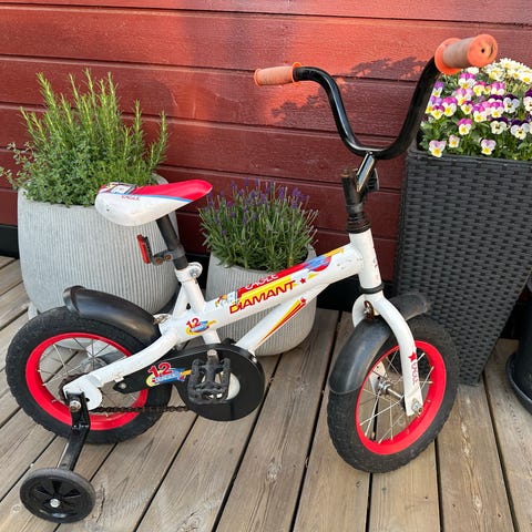 Selger barnesykkel med støttehjul som kan tas av. Håndtakene er slitt men sykkelen er i god stand.