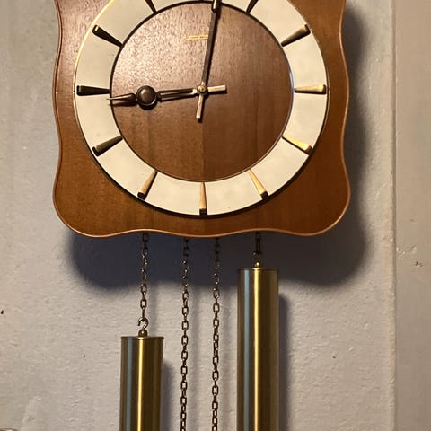 Stueklokke med lodd fra 70-tallet. Slår hver halve time med behagelig lyd. Må trekkes en gang i blant når loddene har gått ned.