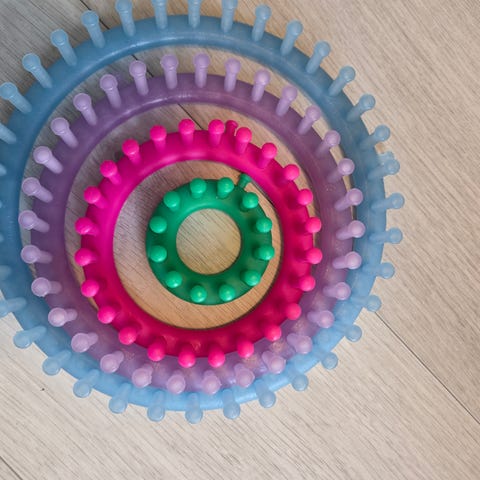 En oval og en rund quickknit, inkludert instruksjonshefte og et oppskriftshefte (se bilde for eksempel på oppskrifter)