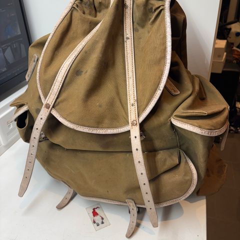 Gammel brukt ryggsekk i lerretsstoff. Flere lommer på utsiden.