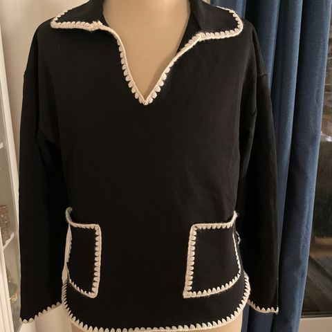 Sort kort genser med stor krave. Den er kantet nederst på ermene, kraven og nederst på genseren med en hvit bord. Genseren er i et tettvevd materiale. Har klipt av lappen så usikker på type materiale men den er myk og god. Ikke i garn men mer som tykk bomull.
