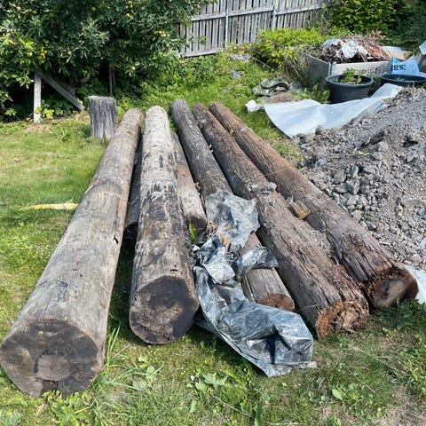 Planlagt brukt som søyler eller portal på hytte, men planer er nå endret.