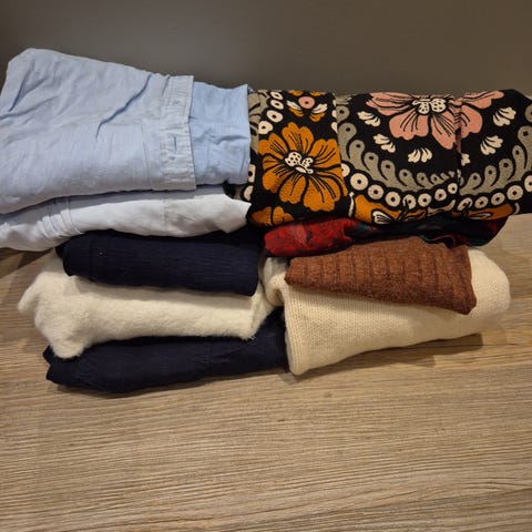 Klespakke med pent brukte klær. Noe er svært lite brukt, noe kan man se er brukt (men ingen hull eller flekker). Str. S/M, bortsett fra den ubrukte toppen som er i XS, men litt stor i størrelsen.