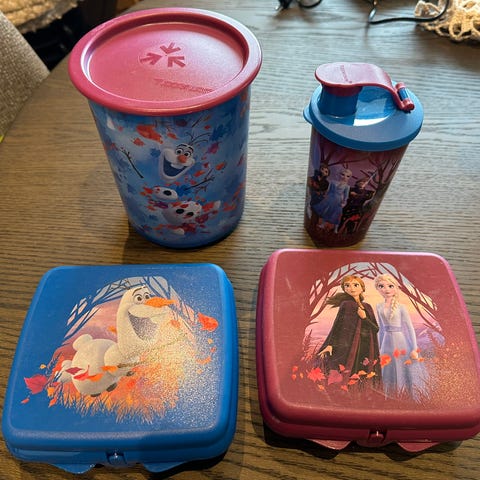 Matbokser og drikke flasker selges samlet . 100 kr
