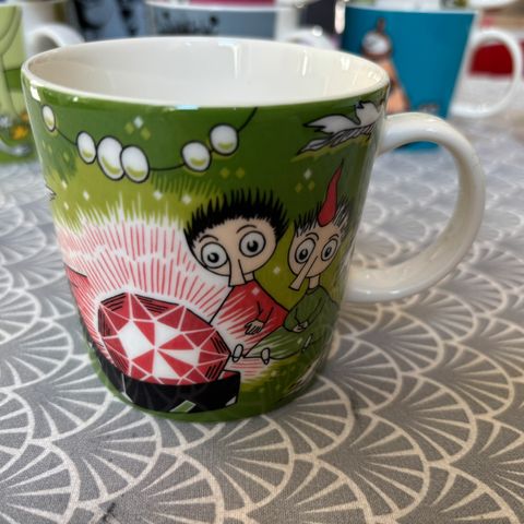 Hver kopp har en liten tekst i bånn.