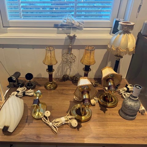 Diverse bordlamper i messing, onyx, keramikk, porselen. Noen med jordet støpsel, andre ujordet.