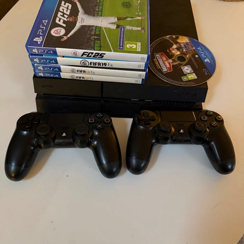 Playstationen er godt brukt, men funker som den skal. Den er ikke mistet i bakken en noen gang blitt ødelagt på en eller annen måte. Fordi den er så gammel som den er så vil den kanskje være litt treig, men den kjører spill som den skal og kan spille spill som fortnite, rocket league og warzone. Spill som kan kjøpes ved siden er Sims 4, FIFA 20, The Crew 2 og Horizon zero dawn. Disse selges for 50kr per spill. Kontrollen er kjøpt for ikke så lenge siden og har ingen skader. (The sims 4 er solgt)