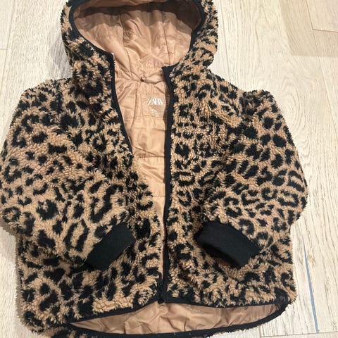 Pent brukt fuskepelsjakke med leopard-mønster. Fake fur. Str 134/140, 8-10 år. Avtagbar hette med ører. Brukt av ett barn, røykfritt hjem.