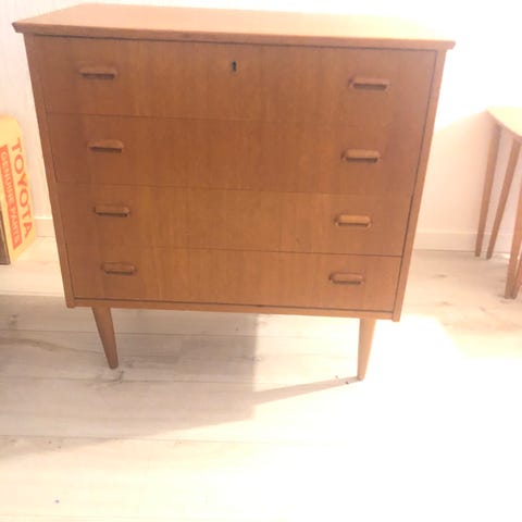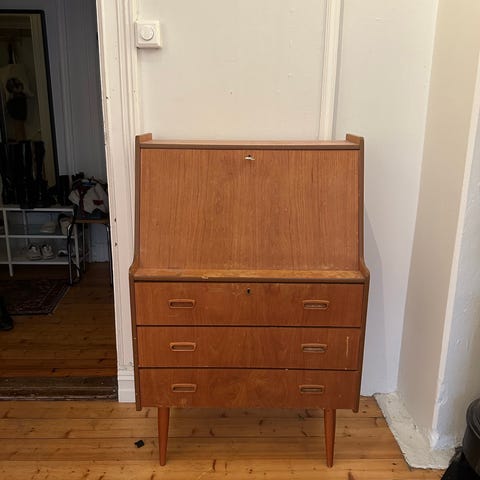 Skattol i teak. Oppussingsobjekt. En god del merker. Kun én skuff inni skatoll. Et par skuffer må løftes litt for å få dem igjen. Lås som funker både på nedvippbar bordplate og øverste skuff. Funker fint som den er nå som hjemmekontor.