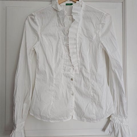 Hvit bomullsbluse fra Benetton i størrelse small. Flotte rynkedetaljer/ volanger i utringningen og ved ermene. Kragen kan brettes inn eller ut, avhengig av hvordan man ønsker den. Veldig lite brukt, men en liten flekk er nederst på venstre erme (se bilde), ellers ingen bruksmerker. Materiale 78% bomull, 19% polyamid, 3% elastan.